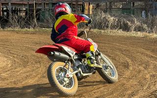 確か去年の今ごろは無段変速のヤマハPW50かホンダQR50に必死の形相で乗ってらした我が家の第二子さん。この1年は遠心クラッチ3速の50ccマシンに乗ってたんですが、一回り大きい70ccも乗ってみる!とか言い出したので、足は届かないけどまぁいいかと思って試しにご乗車いただいたんですが、パワーはともかく車格があってホイールベース長めな方が動きが緩慢で案外乗れることに気づいてしまった様子。嗚呼こうやってキッズは段々おっきく育っていくのねー・・・。と遠い目の私。
