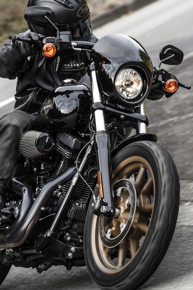 そして、加速力を支える前後のサスペンションとブレーキが素晴らしいんですよ。ハーレーって基本的にリアタイヤに体重を乗せてコーナリングすることが多いんですけれど、ローライダーSは一般的なロードスポーツみたいに、フロントブレーキをコーナー進入まで残して、ブレーキリリースをきっかけにグルッ!と曲がる、っていう走りかたができるんです。フロントフォークが優秀で、前輪の接地感が確かだから、フロントタイヤを頼ってのコーナリングが楽しめるんですね。 そりゃもう、グイグイとコーナーに飛び込んでいけます。