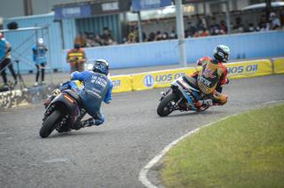 エナジードリンクメイカーのサポートライダー2人が、朝からそれぞれ何本飲んだのか (あるいは水筒のガワだけで中身は別物なのか?) クンクンお互い嗅ぎ合っているの図・・・ではありません。ケンタッキー州レキシントンでつい先日開催されたAFTダブルヘッダー "レッド・マイル" の1日目、8周のセマイファイナル・6周目のターン進入で思いっきり接触したジャレッド・ミースとJ.D.ビーチ、パドックエリアに戻るやいなやヒートアップした6歳年上のジャレッド35歳が、J.D.のヘルメットのチンガードをむんずと掴み、"このヤロー危ないマネしやがって今度やったらXXXだぞ!" と恫喝?教育的指導?する瞬間がLI...