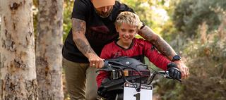 2016年最終戦での象徴的なデビュー、文字通り現役ベストメンバーで編成されたファクトリーチーム "Wrecking Crew" による翌シーズンからの猛進撃に始まり、現在も本場アメリカのプロ・ダートトラックレースシーンの第一線で、最強王座に君臨し続けるインディアンFTR750。ちょうど2年前には、レーシングマシンのイメージを纏った精悍な公道版・FTR1200も発表されましたが、この秋ベールを脱いだのは、なんと8歳以上を想定したオールNEW・エントリーマシン "eFTR Jr" です!